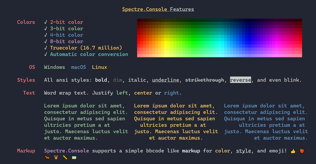 Technisch orientiert sich Spectre.Console am aus diversen Webforen bekannten BBcode-System. Die nach dem Schema [/] aufgebauten Slots terminieren dabei die einzelnen Formatierungsfelder.